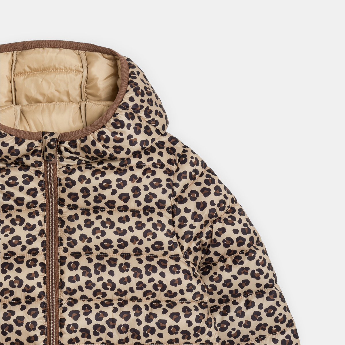 السترة المنفوخة الخفيفة والمبطنة هي قطعة الملابس الخالدة من نسخة جلد الفهد. قطعة عملية، تمنح الدفء وطاردة للماء : لا غنى عنها. الفتح بسحّاب. ياقة عالية. غطاء الرأس مُبطَّن جيبان. أكمام طويلة. الحافة السفلية مستقيمة. شريط مطاطي عند الحواف.