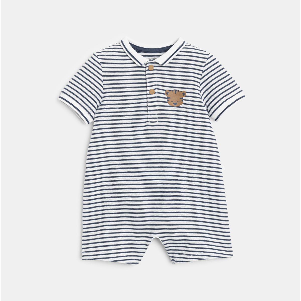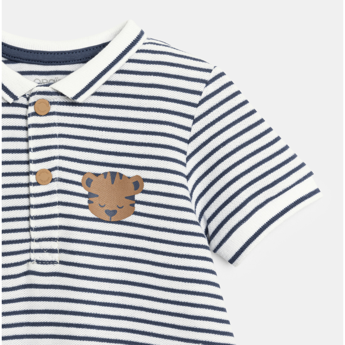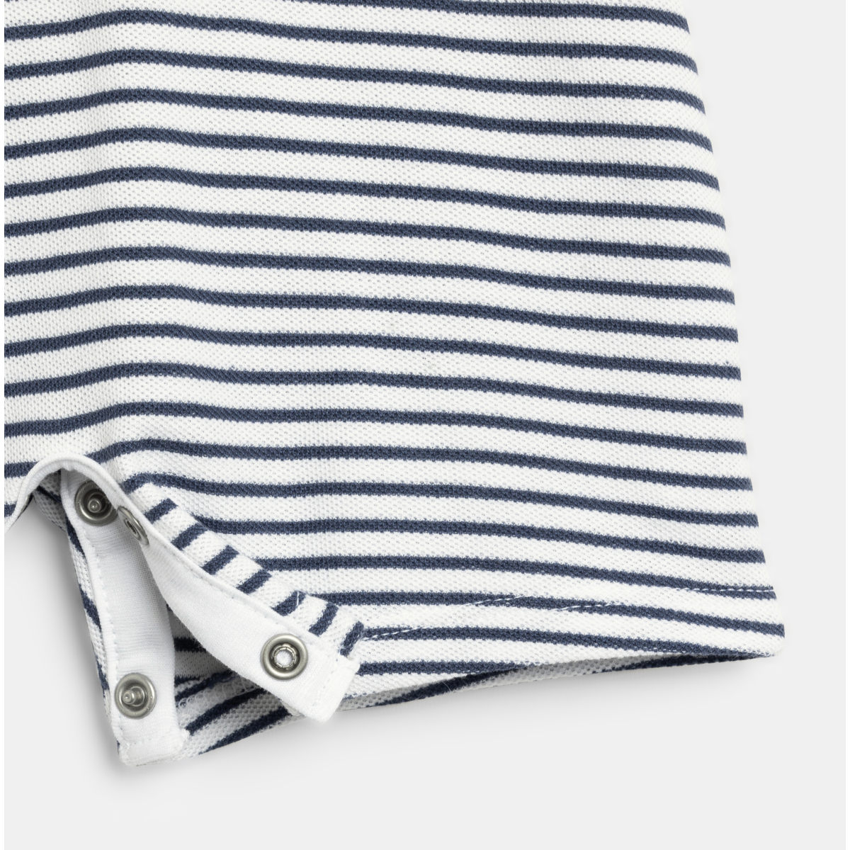 مزيج مثالي يجمع بين الأناقة والراحة، هذا الأفرول القصير سيسعد الصغار بالتأكيد. نحن نحب القماش القطني المضلع بتصميم رقبة بولو والخطوط المقلمة التي تعتبر جزءًا أساسيًا من خزانة ملابس الأولاد. بأزرار كبس بين الساقين لسهولة الارتداء.
