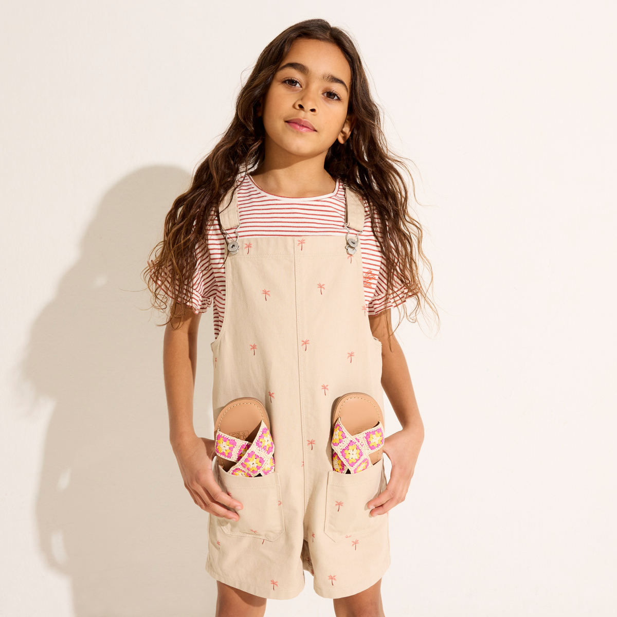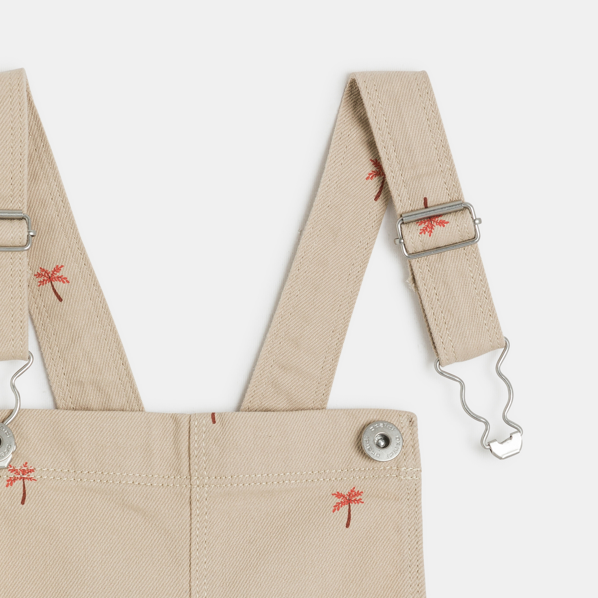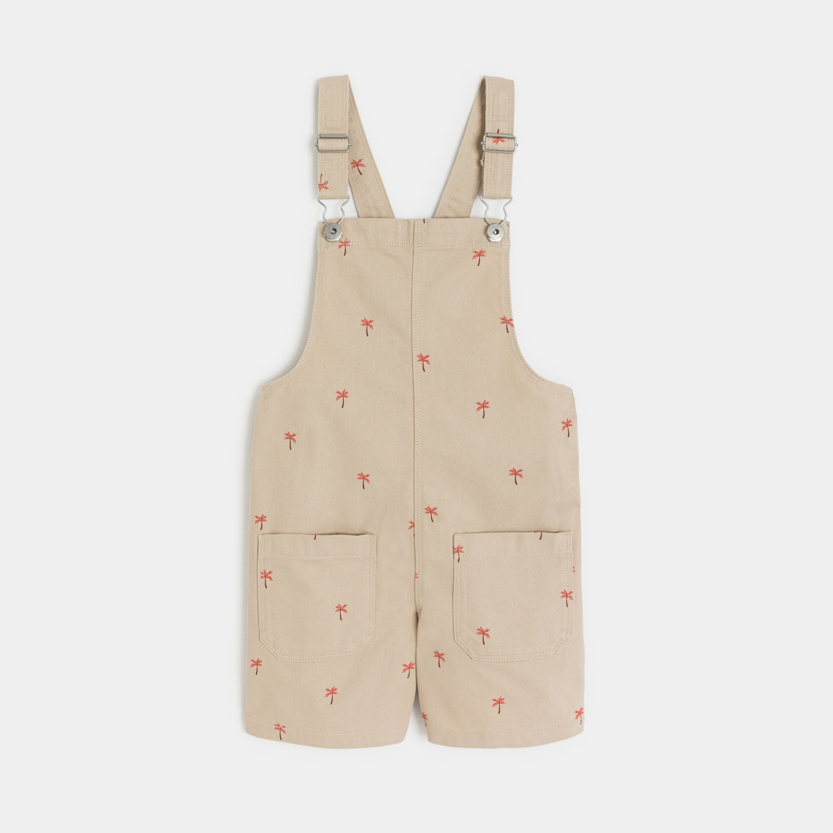 أشجار نخيل صغيرة تزين هذا السالوبيت الشورت المصنوع من القماش: يمكنك أن تشعر بأن موسم الصيف قد حل!  من القماش القطني الطويل. قصّة واسعة وعصرية مع جيبين كبيرين موضوعين في الأمام.  حمالات قابلة للضبط، مشابك معدنية. خياطة من اللون ذاته.