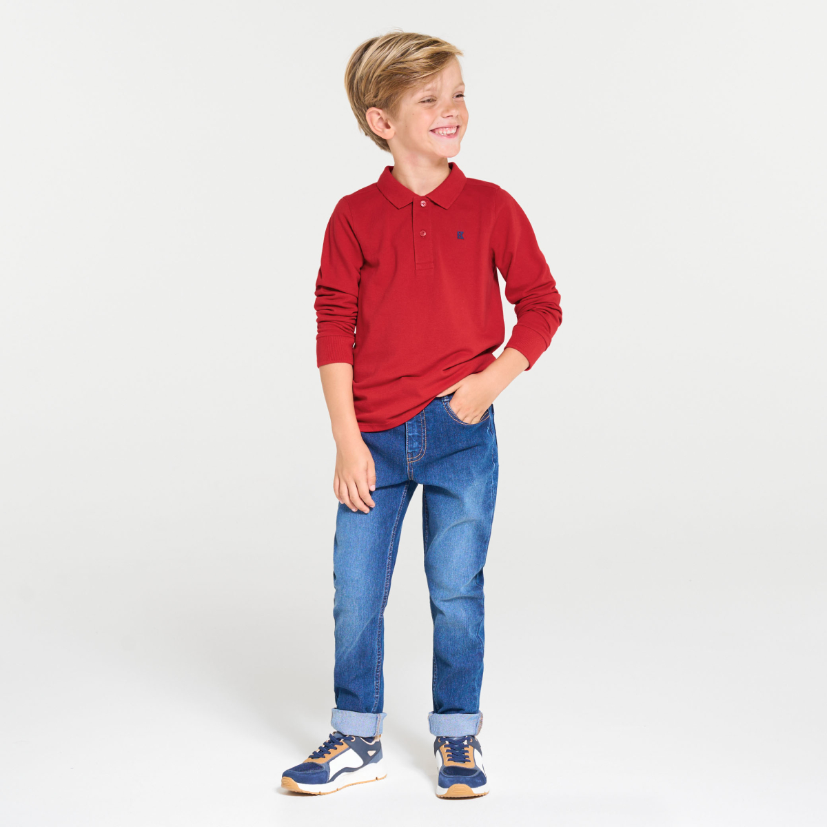 قميص بولو بأكمام طويلة من قماش الجيرسيه المضلع، أحمر اللون، للأولاد