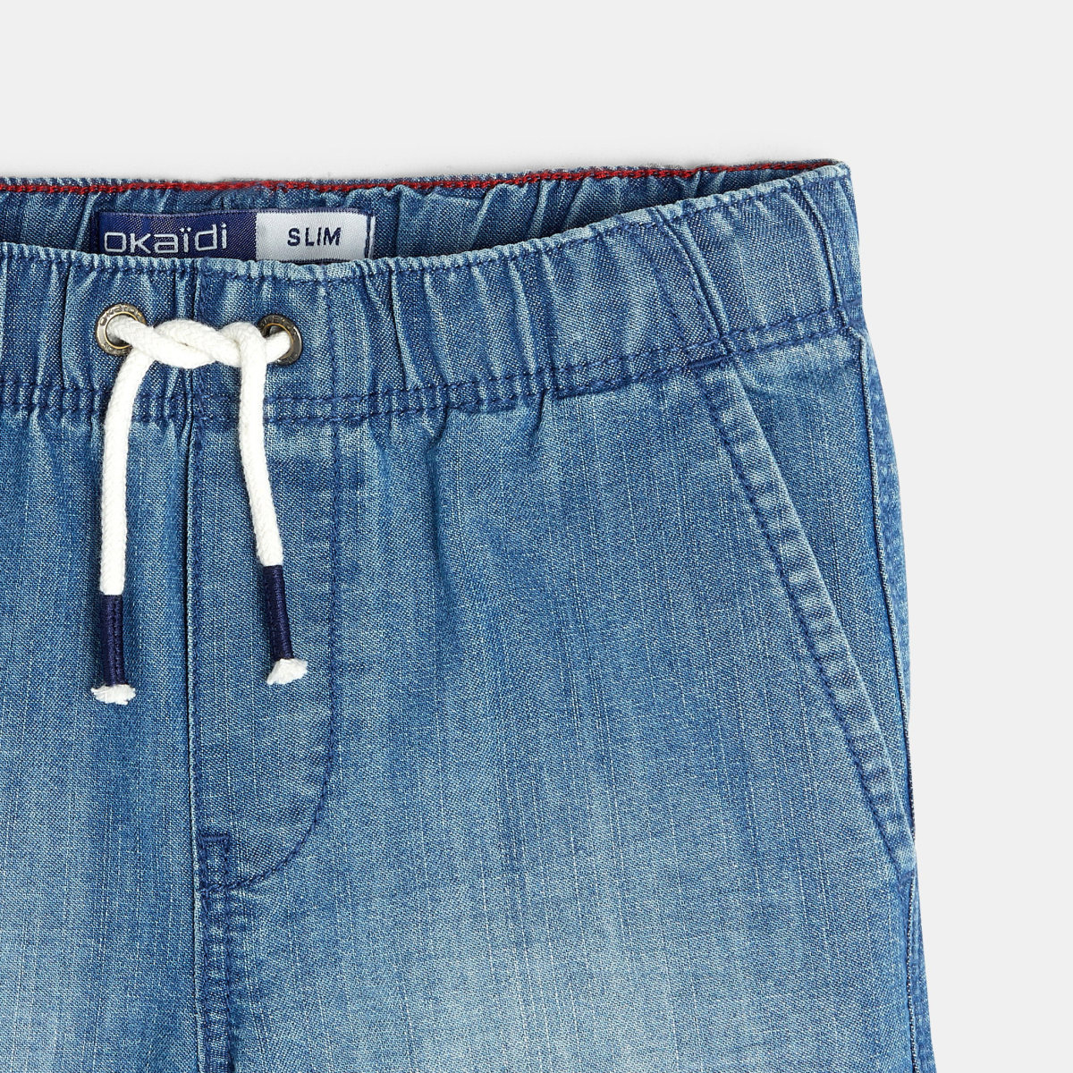 شورت برمودا ولادي. قصًة ضيقة. دنيم من القطن الناعم والمريح في الارتداء. طيًات مكرمشة ولون باهت في أماكن محددة. خصر مطاطي، رباط منزلق داخل فتحات معدنية. مقاس الخصر قابل للتعديل من الداخل بشريط مطاطي بأزرار. 2 جيوب إيطالية. 1 جيب وهمي في الخلف. خياطة قابلة للتعديل. خياطة بنفس اللون. ملصق شعار أوكايدي صغير.