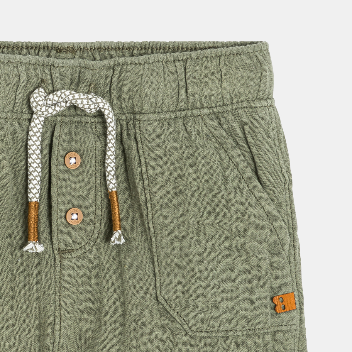 يتمتع الأولاد بالتحرك بحرية تامة في هذا الشورت المصنوع من قماش الشاش القطني المنقوش. خصر مطااطي مريح للغاية وقابل للتعديل، مزود بزر ورباط شد فاخر.
