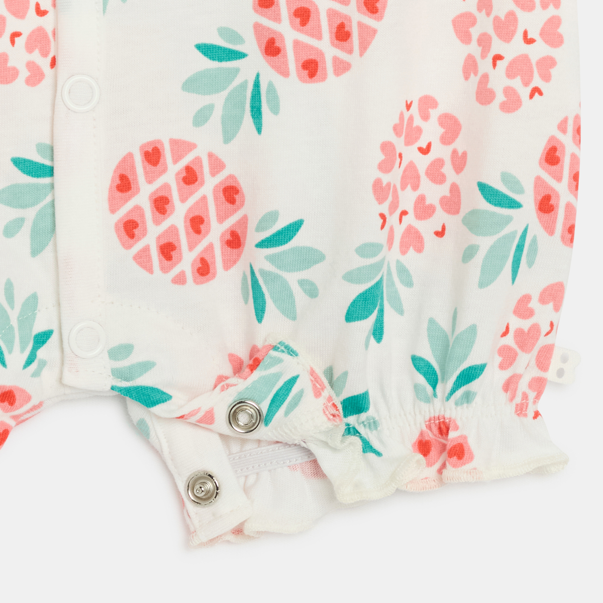هذا الأفرول القصير المزين برسوماته الرائعة مثالي للفتيات في الأيام الحارة: أكمام قصيرة مكشكشة وفخذان مطاطيان لتوفير أقصى درجات الراحة. ولكي ترتديه الصغيرات بسهولة، توجد فتحة أمامية بأزرار ضغط.