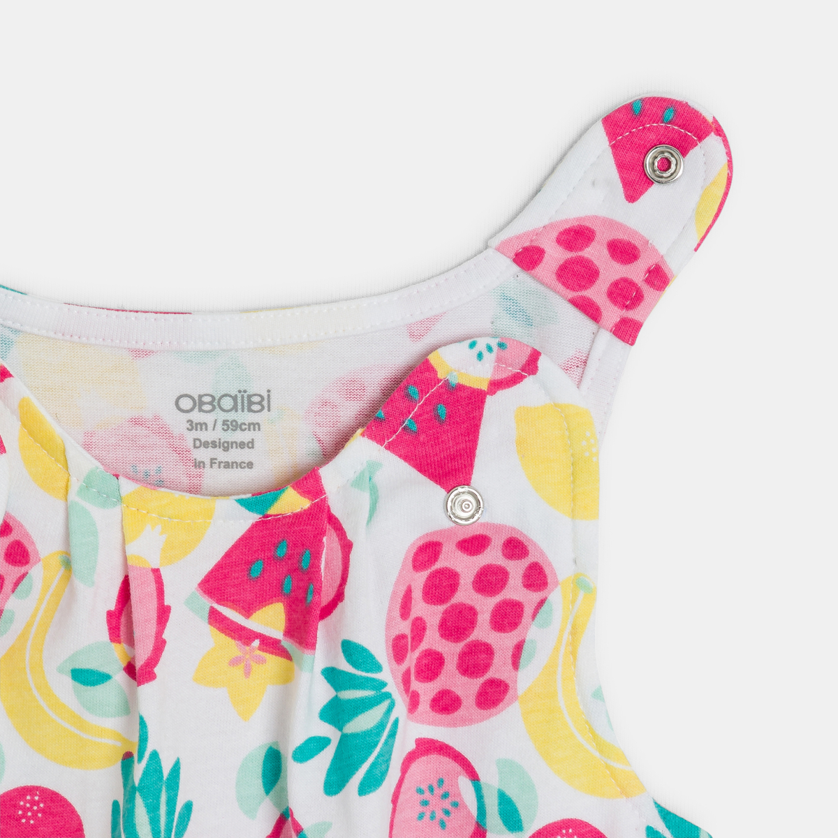 لليالي الهادئة أو الأيام المريحة، يحيط هذا الأفرول القصير الصغيرات بقطنه المناسب لبشرتهن الضعيفة. قصّة واسعة مزينة برسومات فاكهة شهية، مع فتحة بأزرار ضغط على الكتفين وبين الساقين لكي ترتديه الفتيات بسهولة