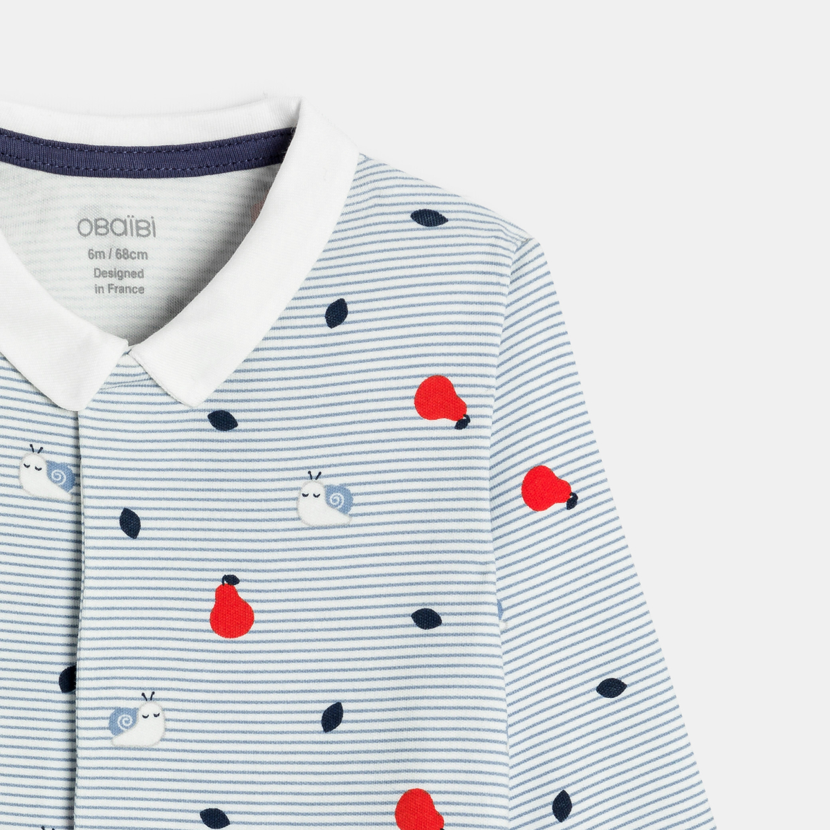 تعتبر الخطوط دائمًا فكرة رائعة في خزانة ملابس الأولاد. تأتي هذه البيجامة ذات القطعة الواحدة مزينة بفاكهة الكمثرى الحمراء والقواقع المرحة. فتحة من الأمام لكي يرتديها الصغار بسهولة وهم مستلقون على الظهر.