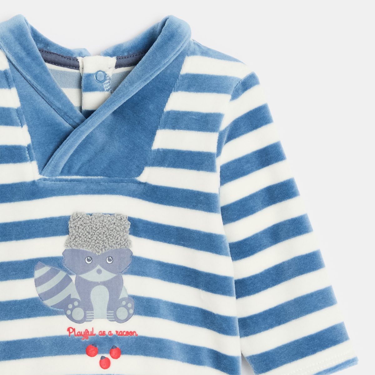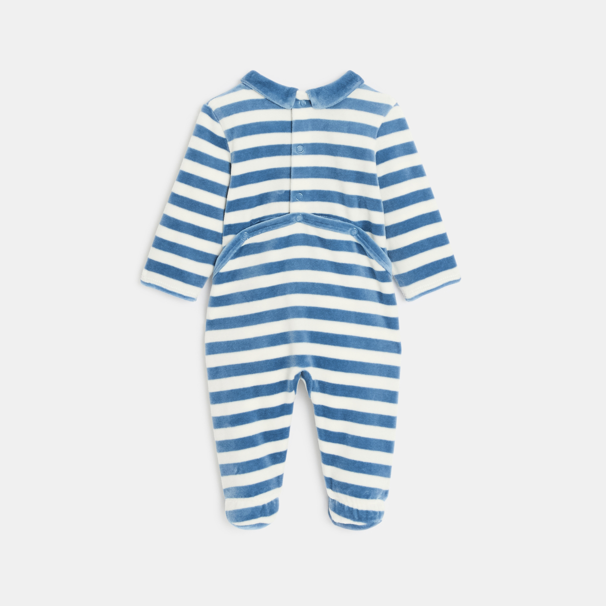 هذه البيجاما المخططة باللون الأزرق مصنوعة من المخمل الناعم والمريح، وهي مثالية لليالي الهادئة للصغار. قَصّة كاملة برجلين للحفاظ على دفء طفلك. ياقة مزدوجة أنيقة، ورسوم حيوانات على الجهة الأمامية. مثالية للاستخدام اليومي وعملية بفضل فتحه بأزرار ضغط في الخلف لسهولة الارتداء.