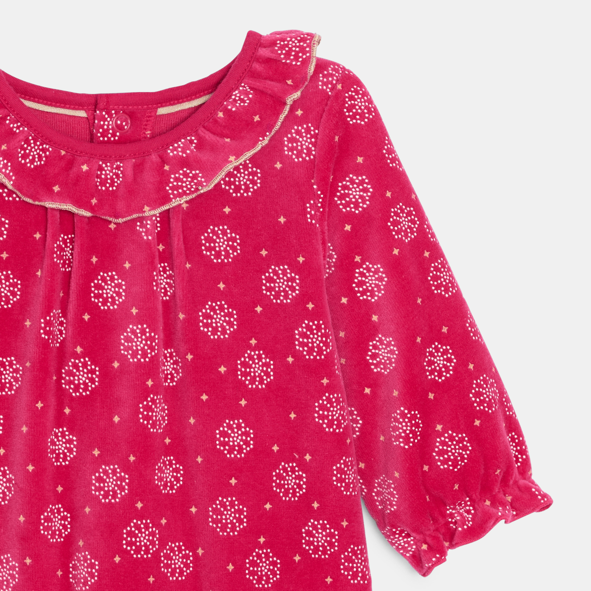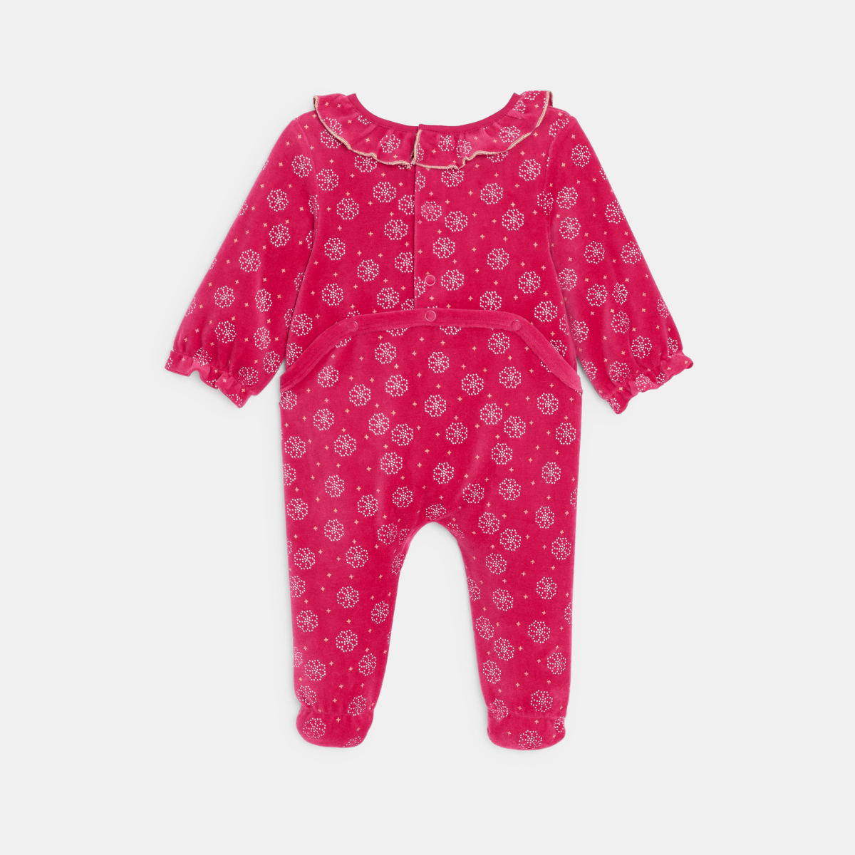 تعتبر هذه البيجاما المزينة برسوم، باللون الوردي من القطع التي لا غنى عنها للأطفال. صُنعت من المخمل الناعم، وتتميز بقصّة كاملة بقدمين مثالية للراحة أثناء الليل. تتميز بياقة مكشكشة رقيقة وأكمام بلمسة نهائية مطاطية تجعل تعديلها بالشكل المثالي طبعة زهور رائعة لقضاء ليالٍ مريحة في المنزل. الإقفال بأزرار كبس لسهولة الارتداء. مثالية للقيلولة والليالي الهادئة.