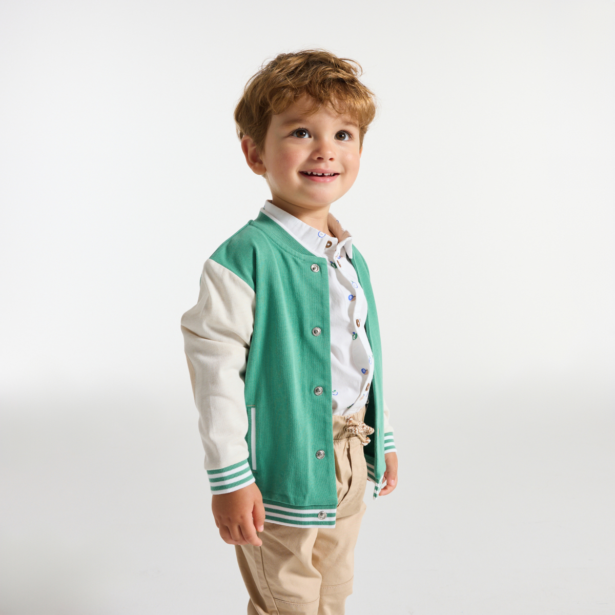 تعد سترة تيدي الخالدة قطعة لا غنى عنها في خزانة ملابس الأولاد الذين يحبون روح الحرم الجامعي. صُنع من قطن مضلع بلونين وأكمام طويلة وتشطيب الحواف مضلعة مخططة. ويسلط الضوء على الفاكهة. الإغلاق بأزرار كبس.