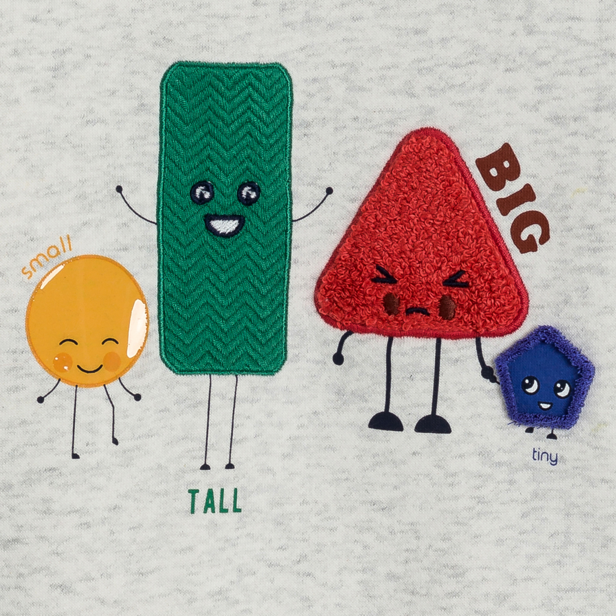 يتميز هذا السويت شيرت الرمادي الناعم والمريح للأولاد بتصميمه المثالي للارتداء بشكل يومي. مصنوع من قماش الميلتون الناعم، ويتميز بقصة عادية وأكمام طويلة. مزين بنقوش هندسية ملونة، ويتميز بفتحة رقبة دائرية كلاسيكية. مثالي للمدرسة أو اللعب، فهو سهل الارتداء ويتيح لك حرية الحركة.