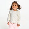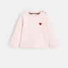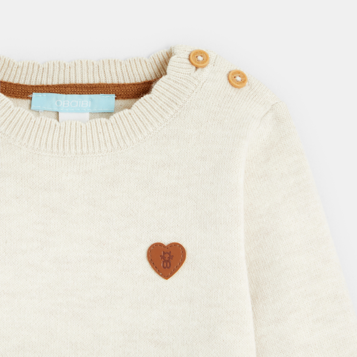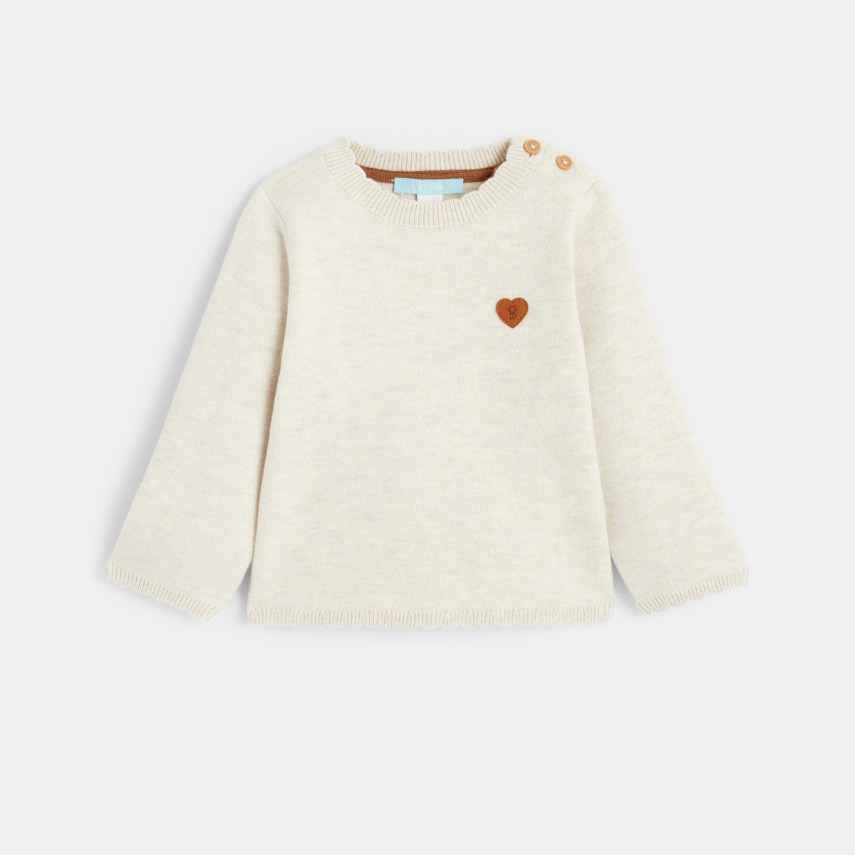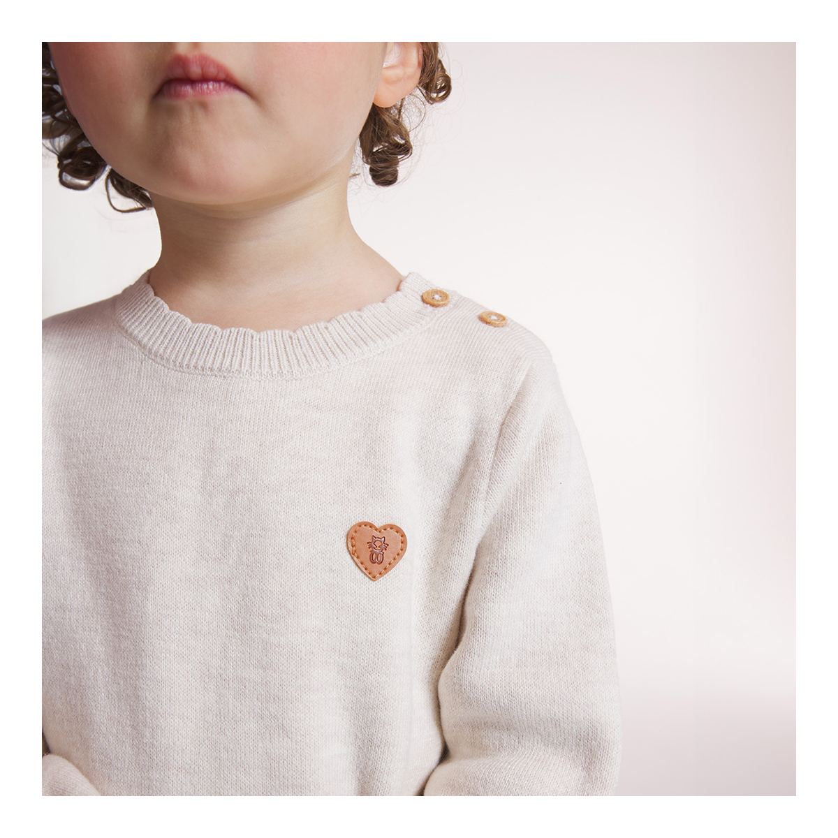 شرنقة من النعومة والدفء لهذه السترة الناعمة المحبوكة على بشرة الأطفال الصغار. قاعدة مريحة متوهجة قليلاً وياقة صدفية لإضفاء لمسة أصلية. قلب مطرز على الصدر. لسهولة الارتداء، يوجد زرين على الكتف.