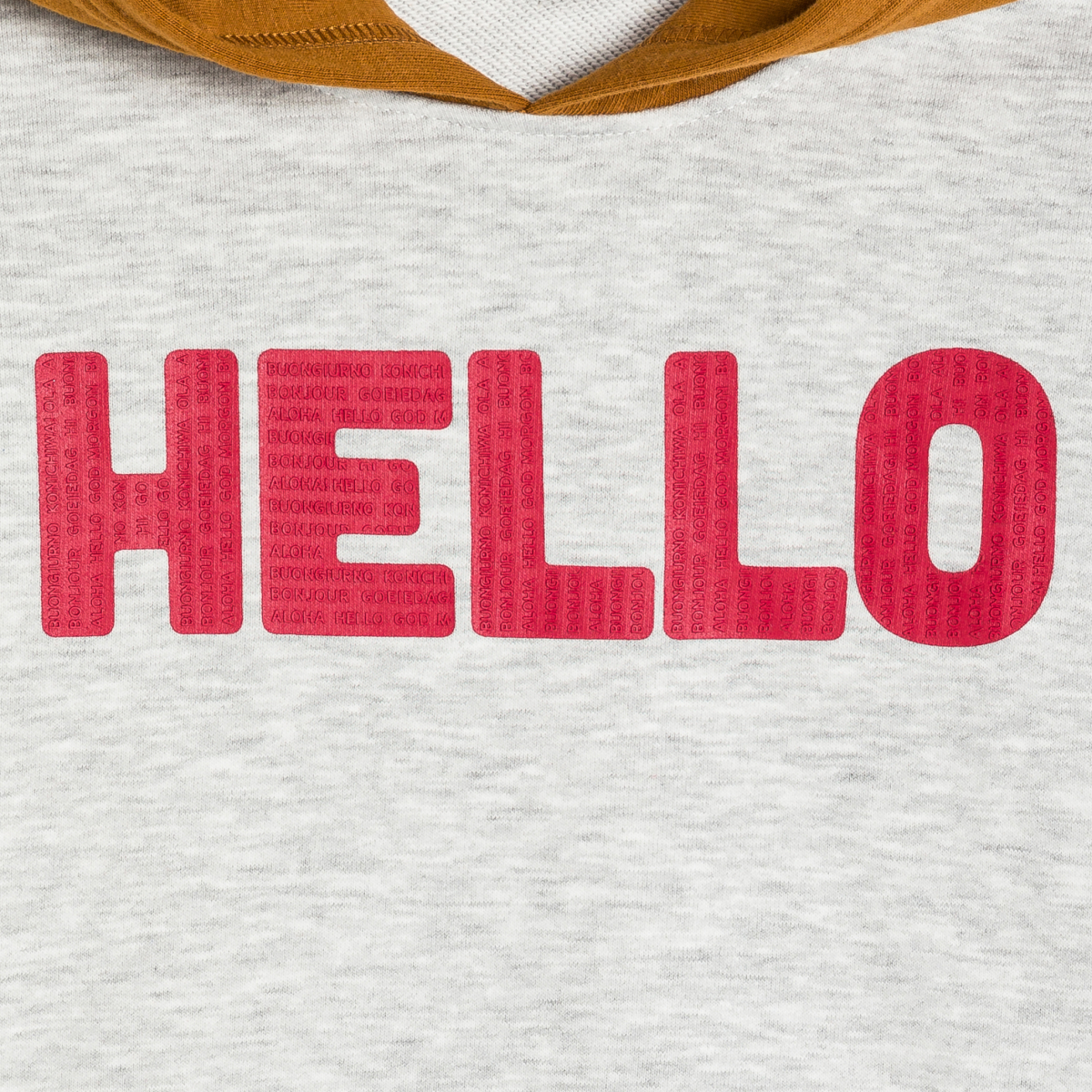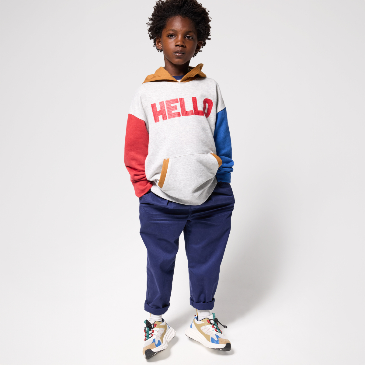الأولاد يقولون مرحبًا (HELLO) بكل شجاعة سواء كانوا يضعون أيديهم في جيب الكنغر أو لا يضعونها. يعتبر هذا السويت شيرت الملوّن ناجحًا بكل تأكيد في أي مكان، حيث يتميز بالنعومة والراحة الرائعة. مصنوع من الصوف الناعم. قلنسوة مبطنة من الجيرسيه. قصّة واسعة وحاشية ضيقة. أكتاف الأكمام منسدلة. أكمام طويلة. لمسة نهائية بحواف مضلعة.