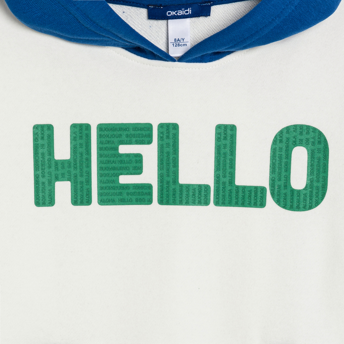 سُترة سويت شيرت بالألوان للفتيان تجمع بين الأناقة والراحة بفضل القصة الفضفاض. مصنوعة من الميلتون الناعم، وتبرُز عليها رسالة "HELLO" بحروف متباينة، كما تتمايز بأكمام يزينها كتلة ألوان، بالأخضر وبالأسود. سُترة تي شيرت عملية للحياة اليومية، حيث لديها غطاء للرأس للوقاية، وجيب شبيه بجيب الكنغر للحفاظ على دفء اليدين. سهل الارتداء ومثالي للذهاب إلى مختلف المغامرات.