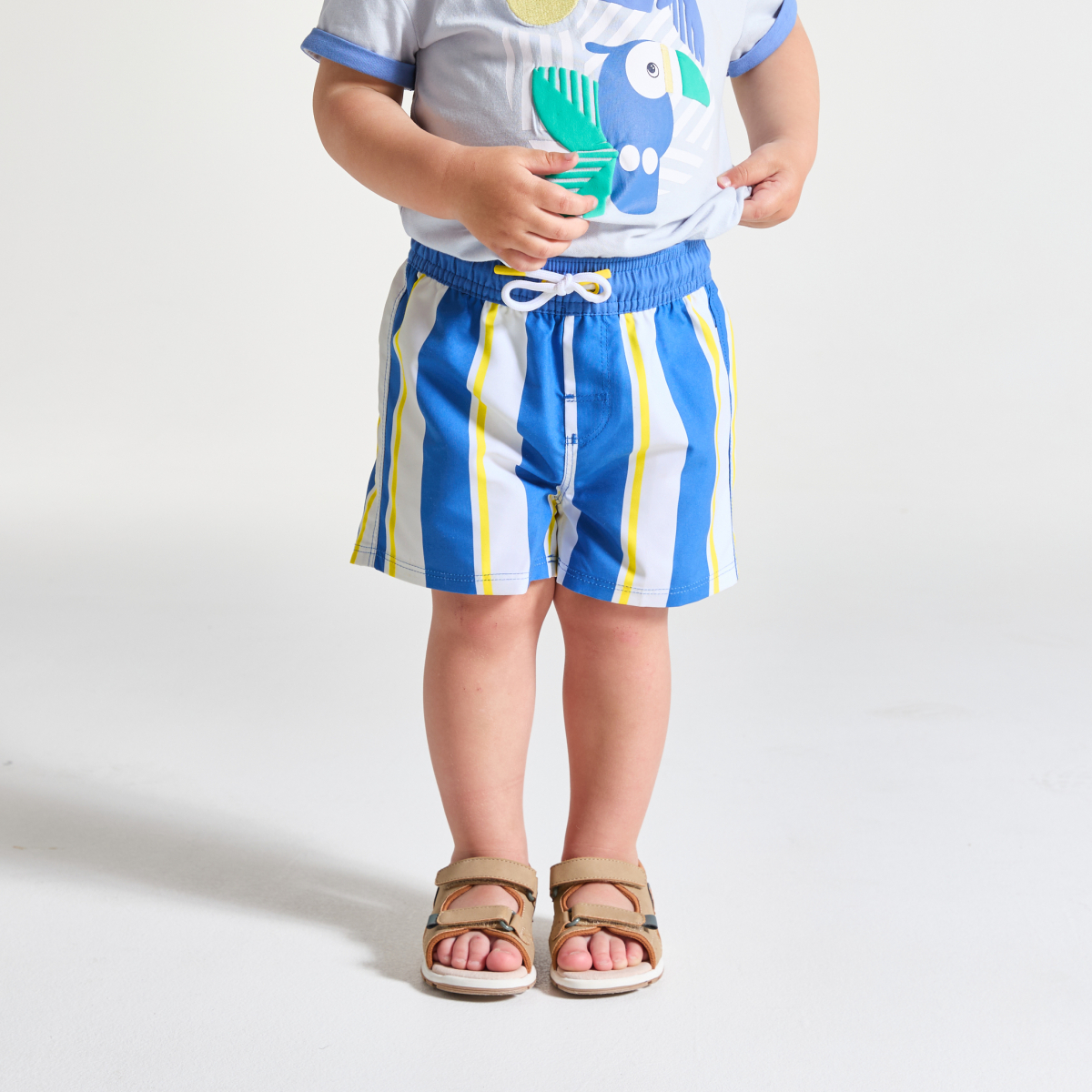 شورت للسباحة مُزيَّن بخطوط مطبوعة، للبحارة الصغار المُتميزين ولديهم ذوق مُنفرد. واقي من الأشعة فوق البنفسجية لحماية بشرة الأطفال الصغار. مايوه للسباحة مصنوع من نسيج الألياف الدقيقة (ميكروفايبر)، سريع الجفاف، وبه خصر مطاطي مزود برباط. الشورت مزود ببطانة ناعمة وغير مزعجة وبسروال داخلي من نسيج شبكي.