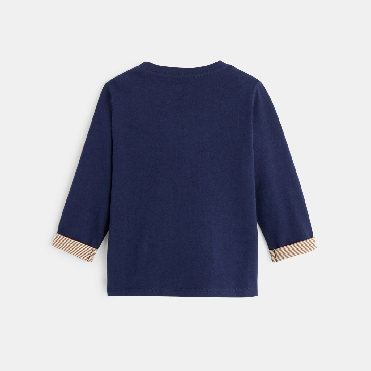 دبدوب على القلب، لإضفاء لمسة رقيقة ولطيفة. إسوارة الأكمام مخططة، لإضفاء لمسة سبور رياضية. ويا للشبه بين الأولاد وهذا الـ تي شيرت ذو الكم الطويل! ياقة دائرية مع أزرار، مريحة وعملية للغاية لتمرير الرأس.