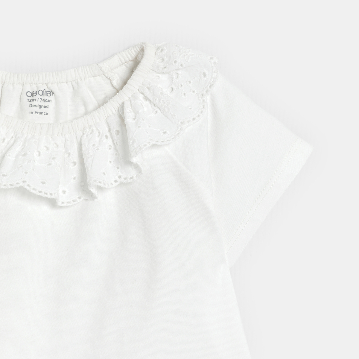 تيشيرت بياقة مطرزة، باللون الأبيض للفتيانت الصغيرات.