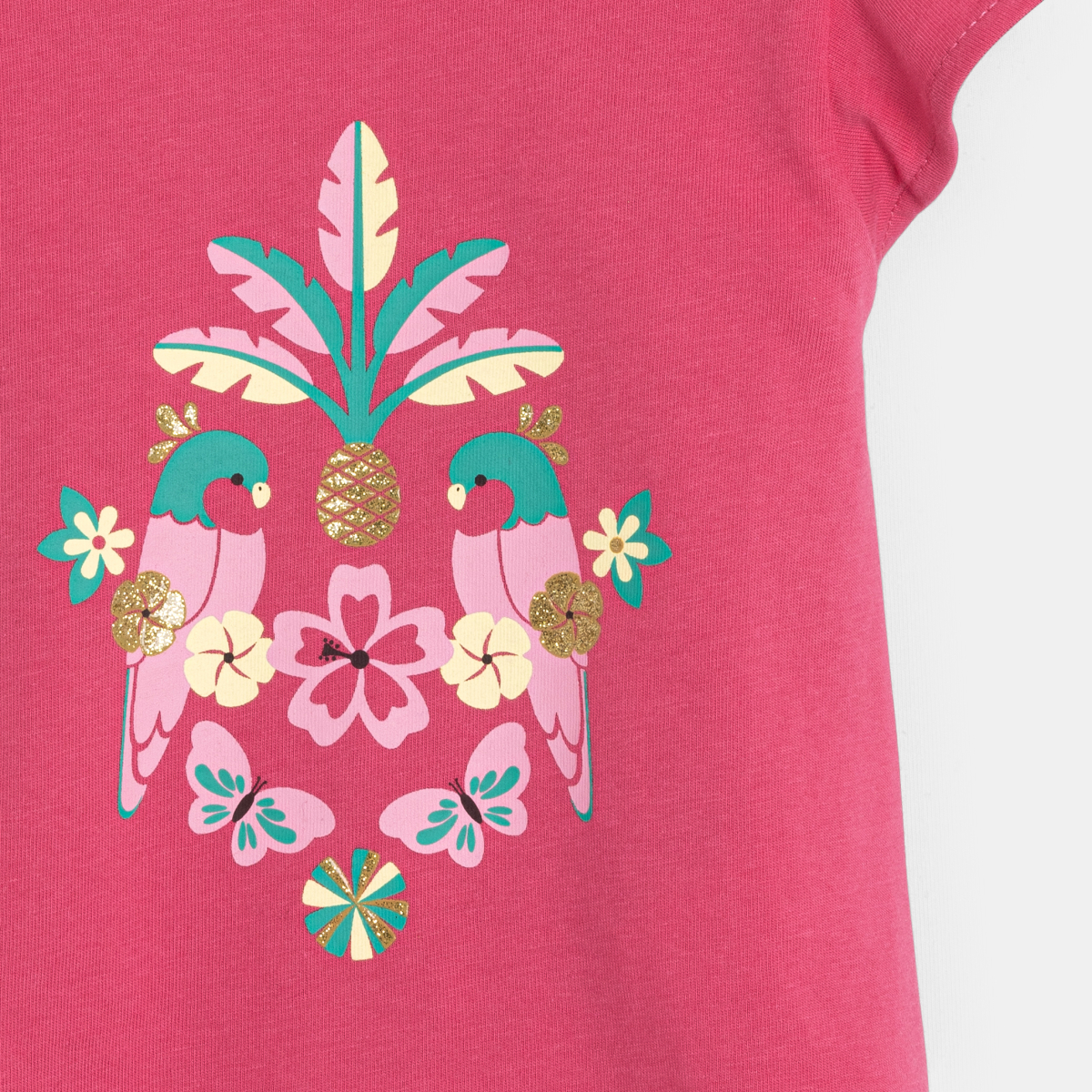 تظهر هذه الطيور في بيئة استوائية... الفتيات الصغيرات يعشقن هذا القميص. أكمام مكشكشة صغيرة وأنيقة وفتحة بثلاثة أزرار كبس لسهولة مرور رأس الصغير.
