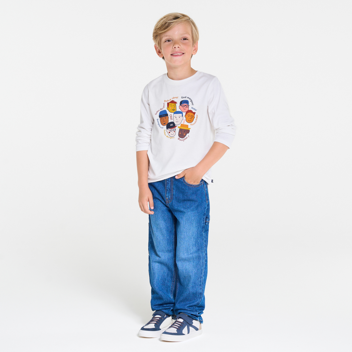 تي شيرت باللون الأبيض للأطفال، مناسب جدًا ارتداءه يوميًا بفضل تصميمه المريح وقصته العادية. مصنوع من قماش جيرسيه ناعم، ومُزيَّن برُسُوم مُلونة لوجوه تُلقي التحية بلغات مختلفة. مُزود بأكمام طويلة وياقة مستديرة، توفر الراحة وسهولة ارتداؤه. سهل إرتداؤه، دون صعوبة أو إجهاد. وسيلة مثالية لإظهار نظرة دولية وروح الود والصداقة