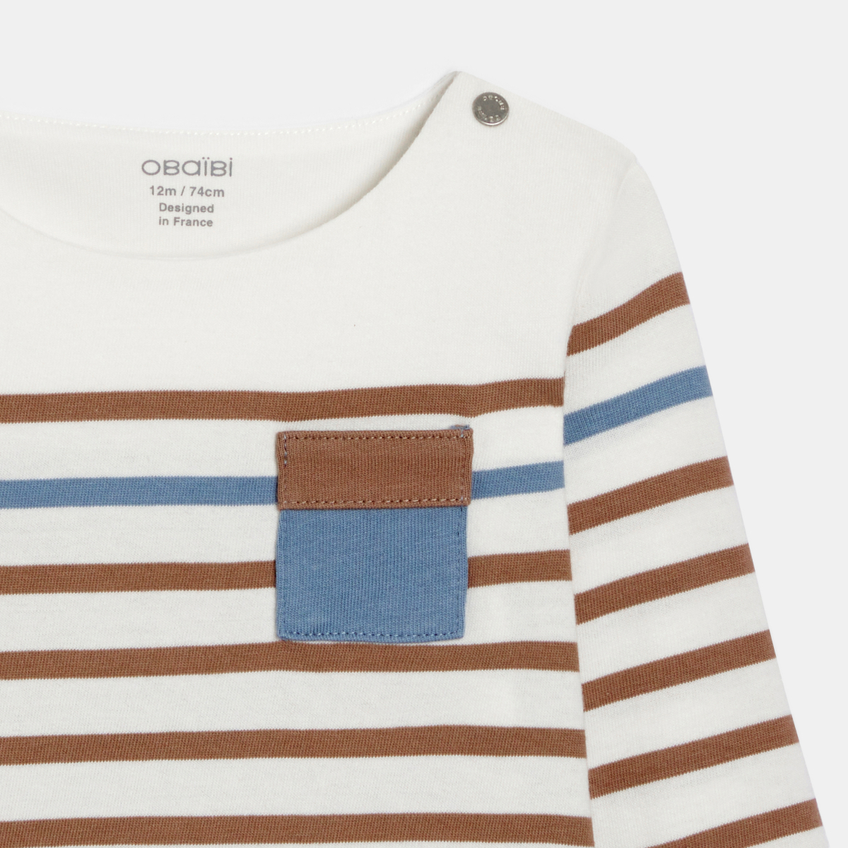 تيشيرت للبحارة الصغار بأكمام طويلة على شكل ملابس البحارة. خطوط جذابة وجيب على الصدر. تمرير رأس الصغير سهل بفضل زري ضغط في كل جانب من الكتفين.