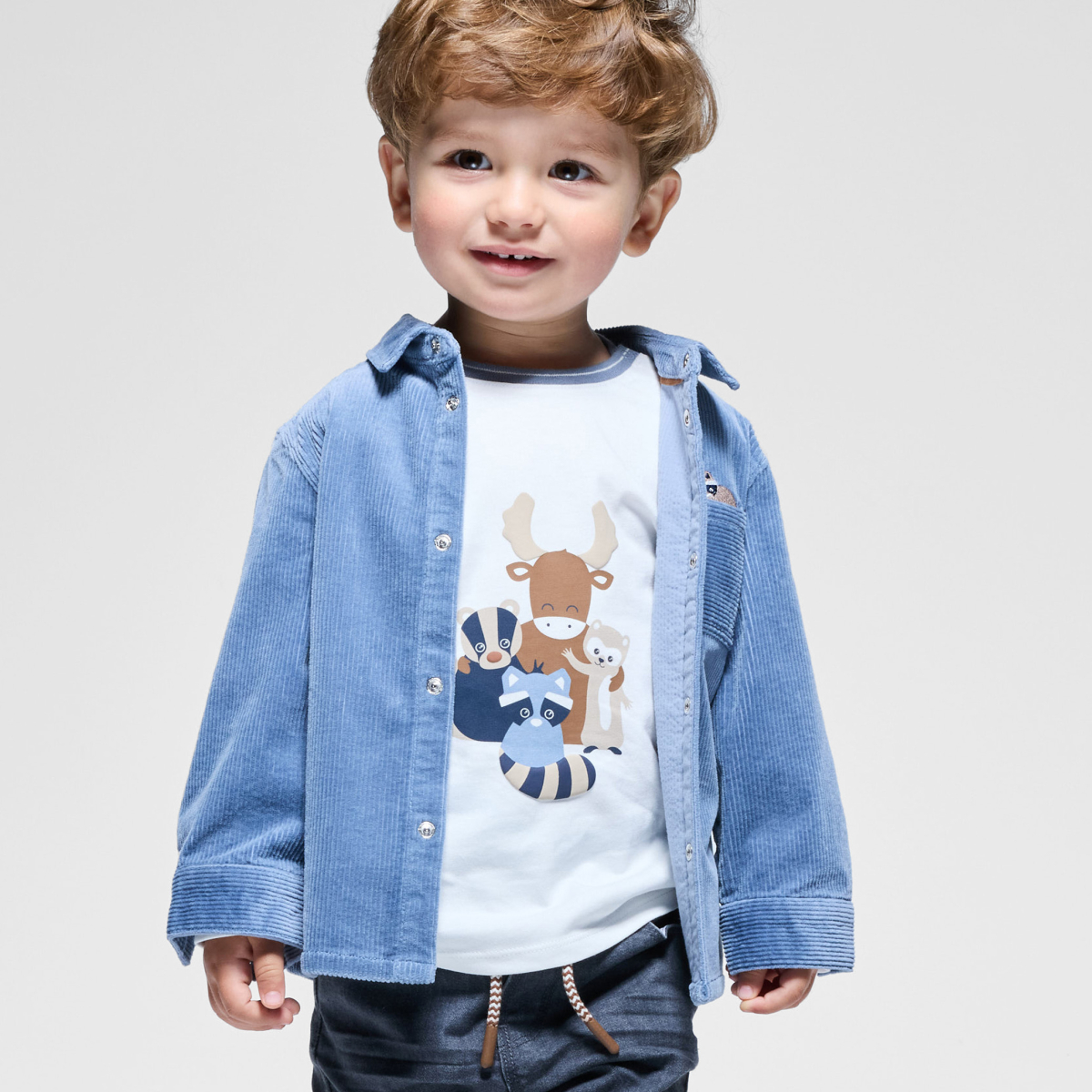 تتأهب حيوانات الغابة على هذا التيشيرت لأخذ الصورة، ومن المؤكد أنه سيصبح المفضل لدى الصغار! قصة بأكمام طويلة من القطن الناعم وياقة بلون مغاير مع أزرار كبس بما يسمح للأولاد بارتدائه بسهولة.
