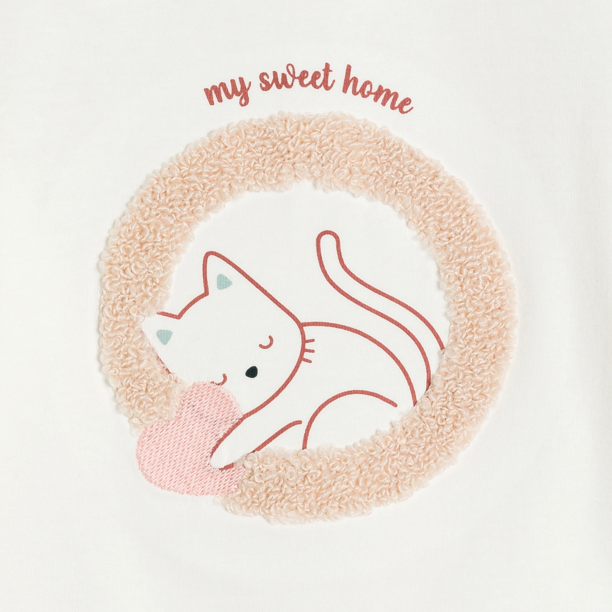 تيشيرت أبيض من جيرسيه ناعم، بأكمام طويلة منفوخة وياقة دائرية. مع رسمة قط محبوب وعبارة "منزلي الجميل". سهل الارتداء بفضل إغلاقه بأزرار ضغط في الخلف. مثالي للاستخدام اليومي مع ضمان الراحة والأناقة الناعمة.