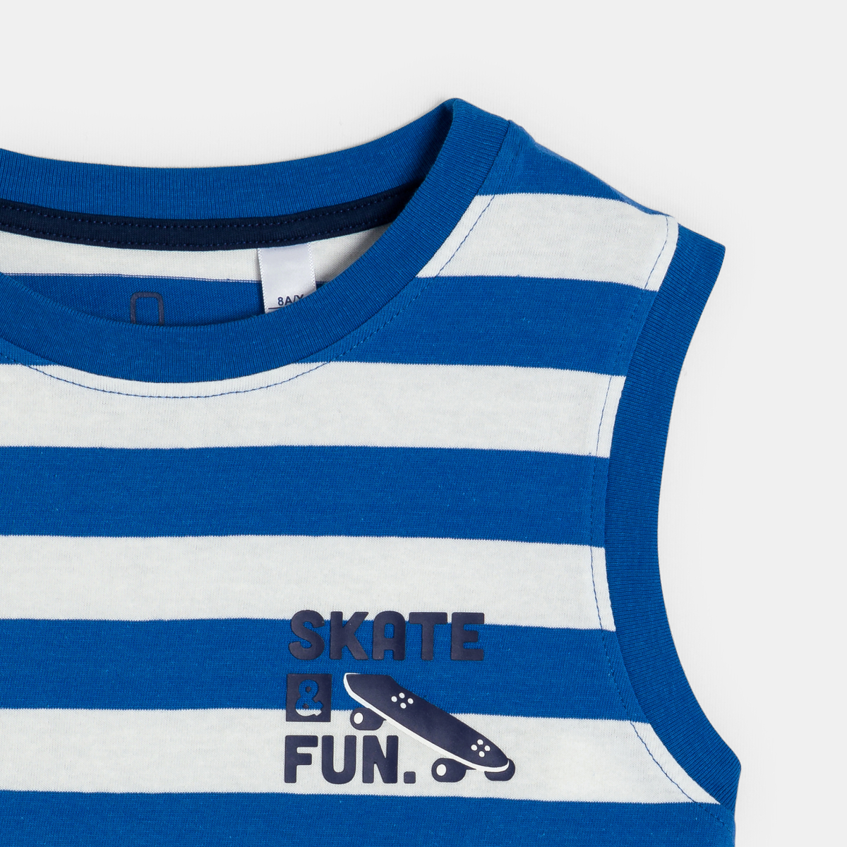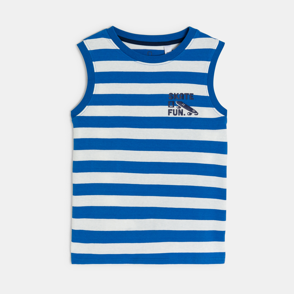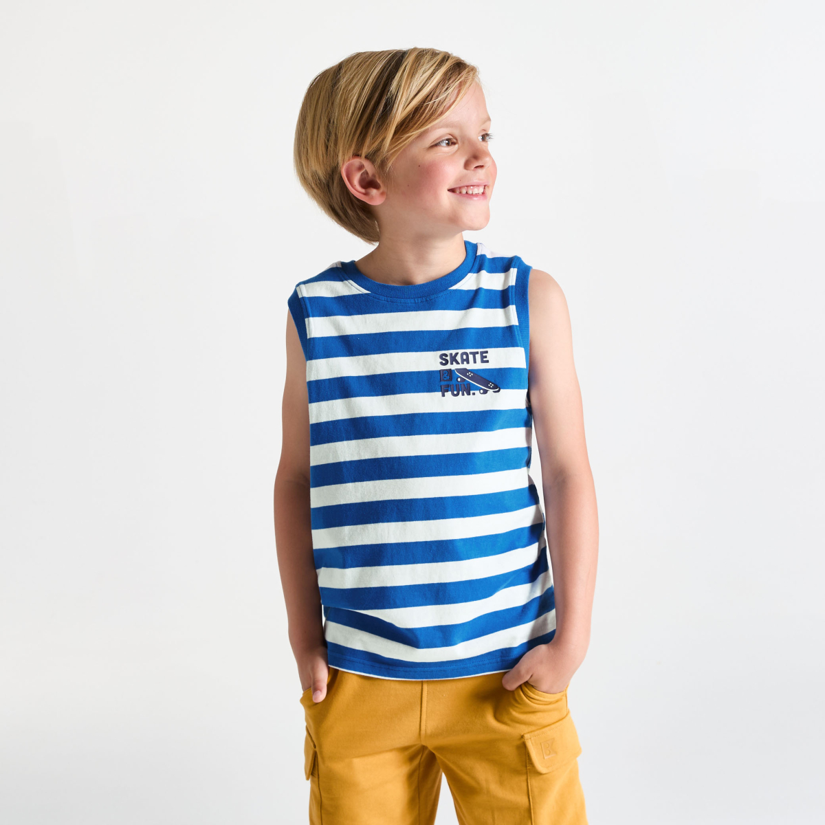 تضفي الخطوط المقلمة لمسة بحرية على إطلالتك: إنها منعشة للغاية! عاش هذا التشيرت بدون أكمام ولوح التزلج المطبوع على الصدر. القماش جيرسيه ناعم وممتع في الارتداء. قصّة مستقيمة. ياقة مستديرة، سهل الارتداء. أكمام بتقويرة هالتر الحواف مضلعة. الحافة السفلية مستقيمة. خياطة من اللون ذاته.