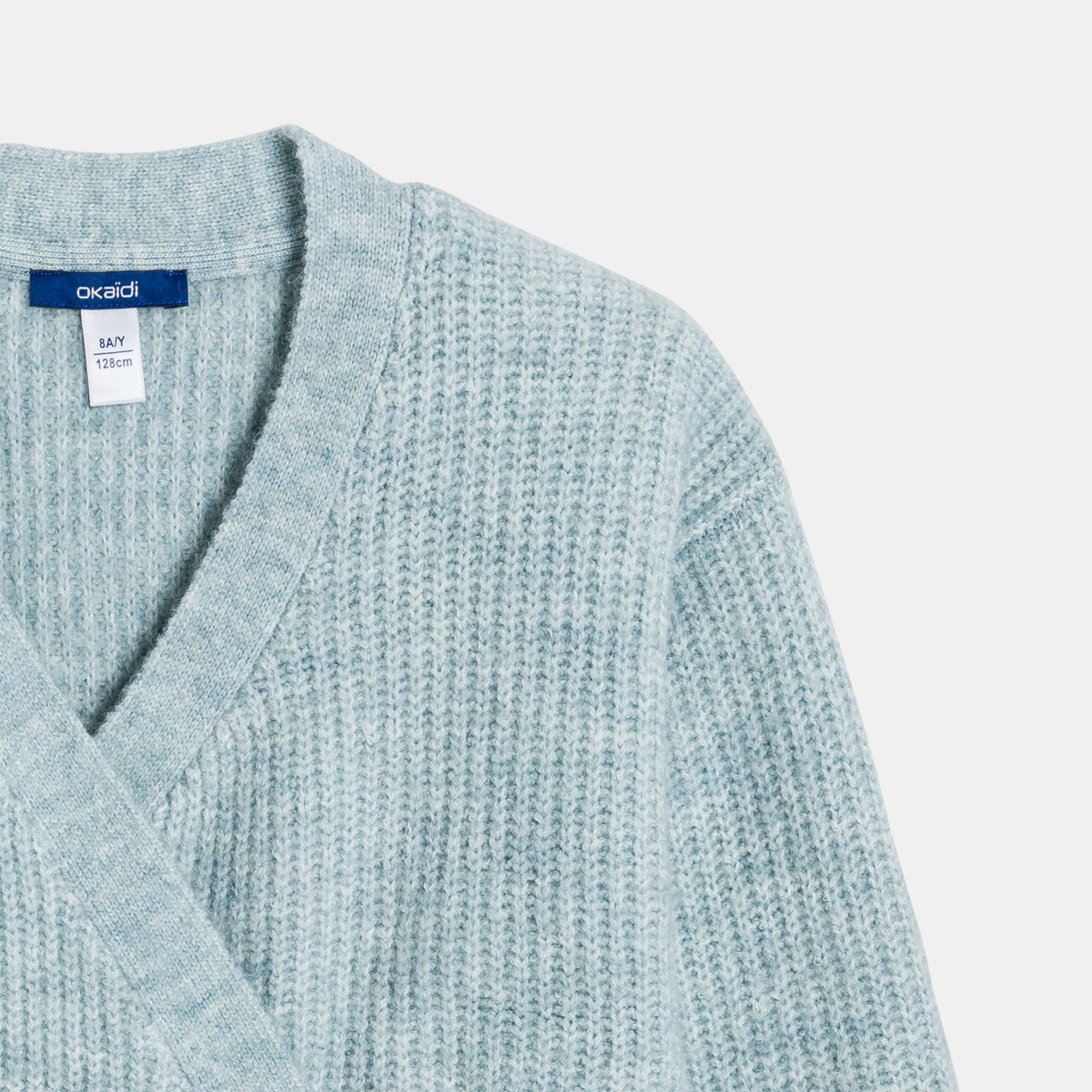 مظهر راقصة الباليه والنعومة في آن واحد: هذه السترة الخفيفة توفر الراحة للفتيات! قماش مرقط ومضلع. فتحة رقبة حرف V متقاطعة، والربطة على الجانب. فتحات الذراعين منسدلة قليلاً. أكمام طويلة. الحافة السفلية مستقيمة. حواف مضلعة.