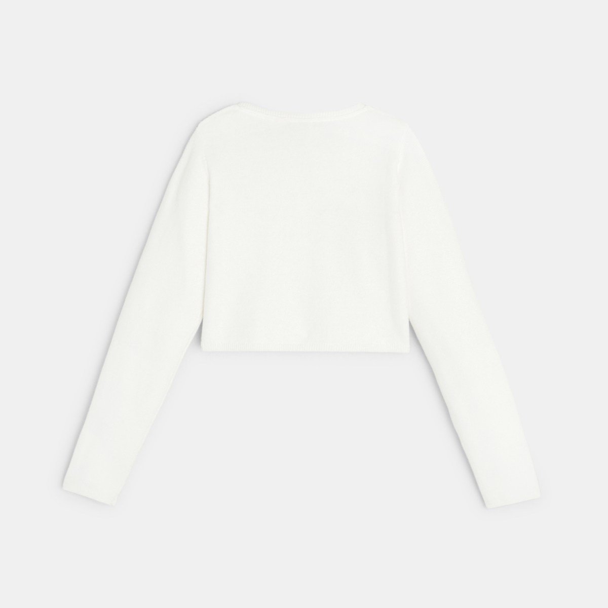 سترة قصيرة على شكل بوليرو بناتي. نسيج صوفي مع ياقة دائرية ناعمة صوف قطبة مقلوبة. قصّة قصيرة. ياقة دائرية واسعة. الإغلاق بإثنين من الأزرار المعدنية الصغيرة. أكمام طويلة. الحاشية السفلية مستقيمة. حواف على الجانبين. ملصق شعار Okaïdi صغير.