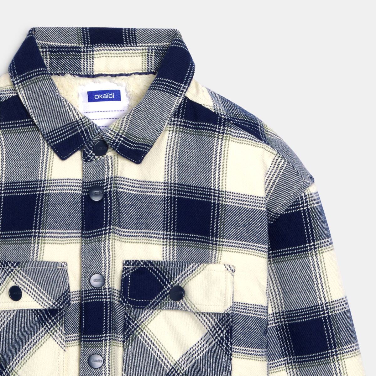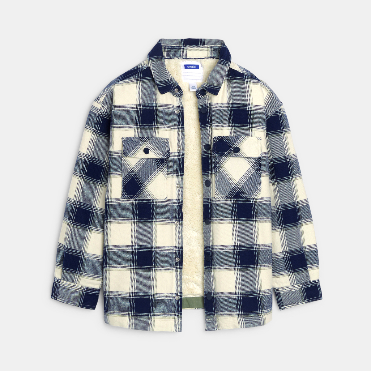 nLes carreaux dans un esprit outdoor canadien forment une alliance douce avec la moumoute sherpa bien chaude à l'intérieur ! Les garçons utilisent cette surchemise comme une veste à la mi-saison avec ou sans manteau l'hiver venu. Coupe droite. Col chemise. 2 poches poitrine à revers pressionné. Manches longues poignets pressionnés. Ouverture pressionnée. Base arrondie.n