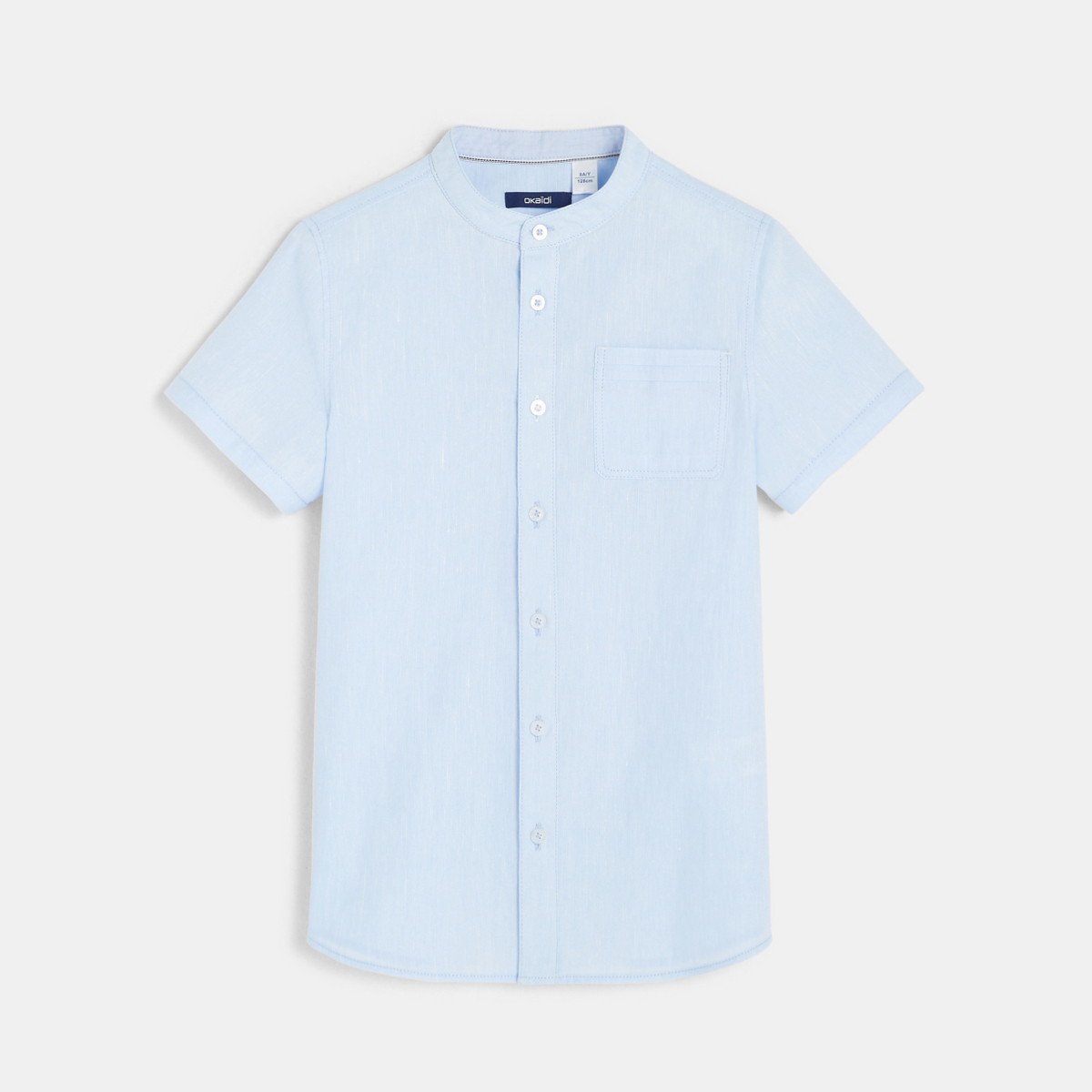 Chemise garçon. Popeline en coton et lin effet tramé. Coupe droite. Col Mao. Epaules doublées. Ouverture entièrement boutonnée devant. 1 poche poitrine. Manches courtes. Base arrondie. Finition piquée ton sur ton. Petite étiquette Okaïdi en détail.