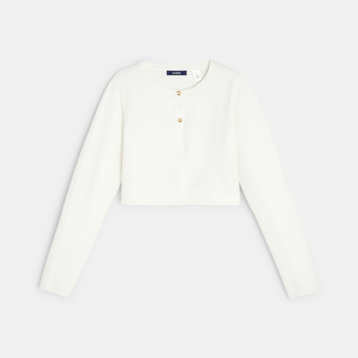 Gilet court style boléro Fille. Maille fine jauge douce point mousse. Coupe courte. Encolure arrondie. Fermeture par 2 petits boutons métal. Manches longues. Base droite. Bords-côtes. Petite étiquette Okaïdi en détail.