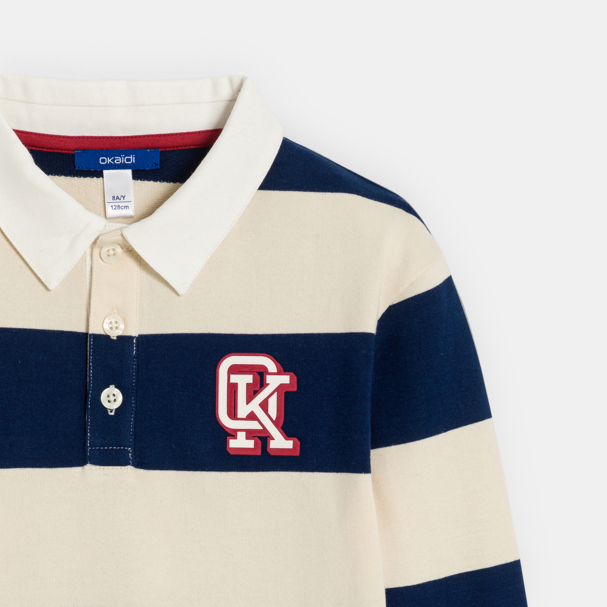 Avec ce t-shirt manches longues l'esprit campus rencontre le style sportswear. Jersey doux et épais. Coupe droite. Larges rayures en fils teints. Col polo avec revers en popeline. Ouverture boutonnée enfilage facile. Logo OK sur la poitrine. Manches longues. Base droite.