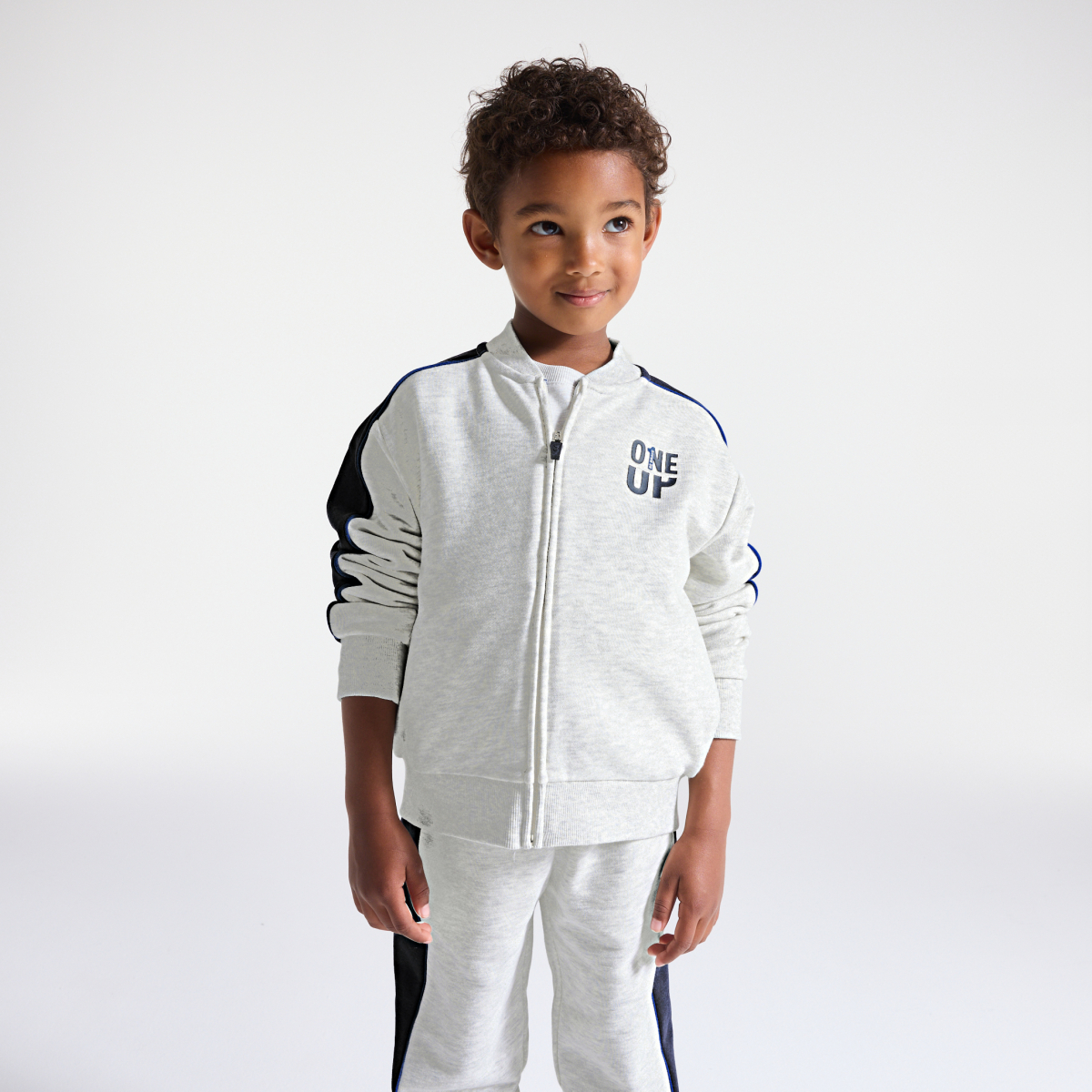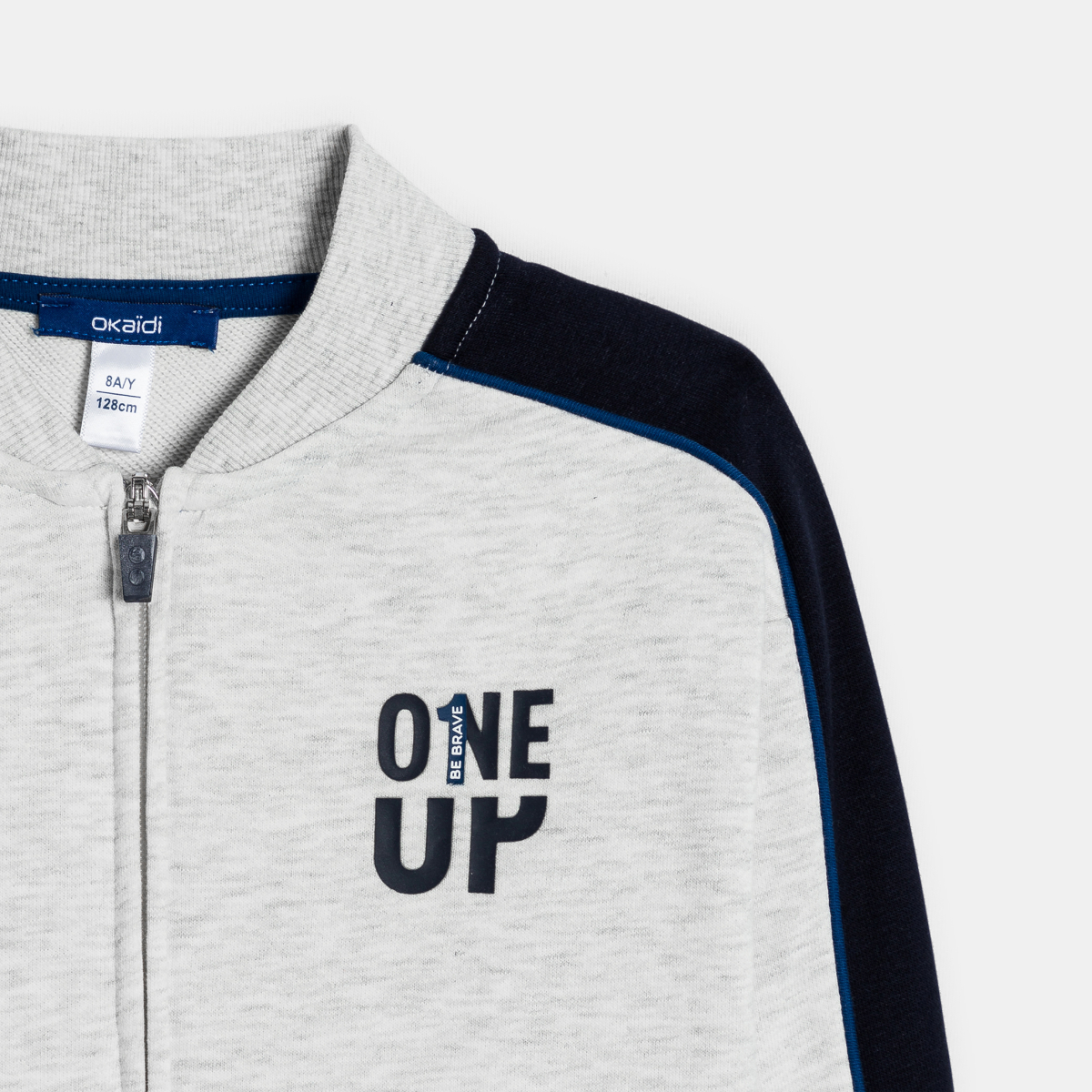 nLes garçons le portent zippé ou ouvert. Avec un jean ou un jogging. Ce sweat-shirt en molleton bicolore et graphique se fait remarquer sur tous les terrains urbains ou sportifs ! Message imprimé sur la poitrine et la manche. Col rond côtelé. Ouverture zippée. Emmanchures marteau. Manches longues. Base droite. Bords côtelés.n