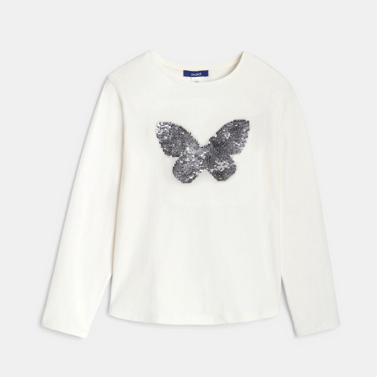 Description Faites glisser votre main à plat sur les sequins brodés, ils se retournent et changent de couleur. Ici, c'est un grand papillon qui fait pétiller les yeux des filles cette saison. Jersey de coton doux. Coupe droite. Col rond. Manches longues. Dos uni. Coutures ton sur ton.